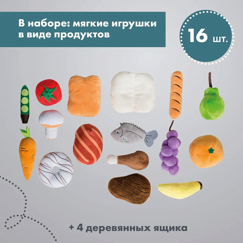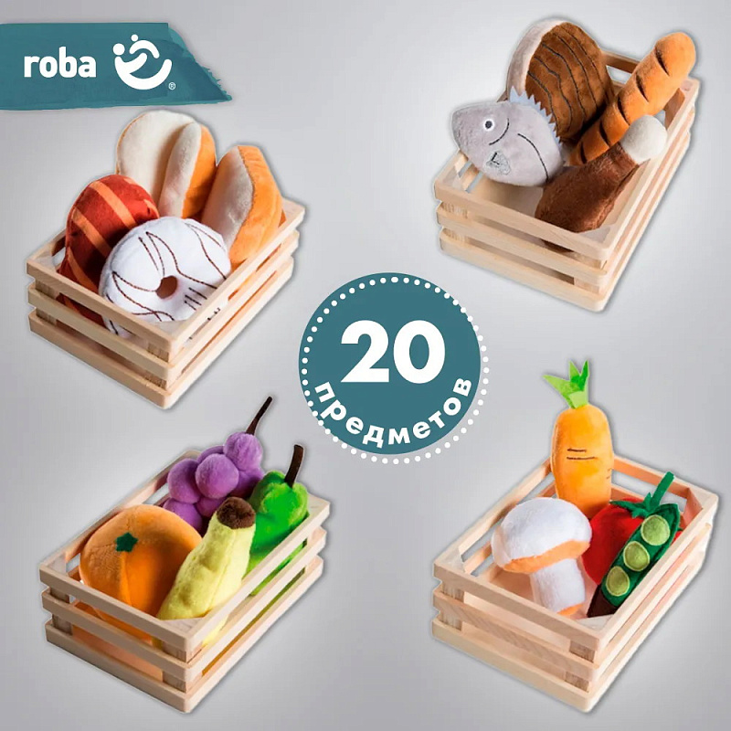 Детский набор плюшевых продуктов для магазина от Roba из 20-ти предметов включает 4 группы продуктов и является идеальным дополнением к любому магазину или игровой кухне. С ним ваш малыш сможет в игровой форме научиться обращаться с едой.