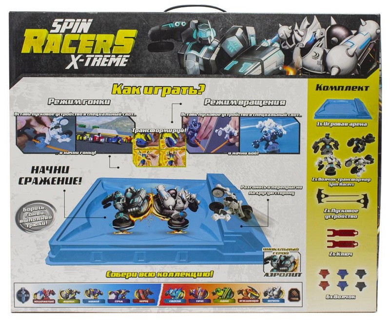 В набореВолчок-трансформер 2-в-1 х2 Пусковое устройство х2 Ключ х2 Волчок х6 Арена для игры х1
