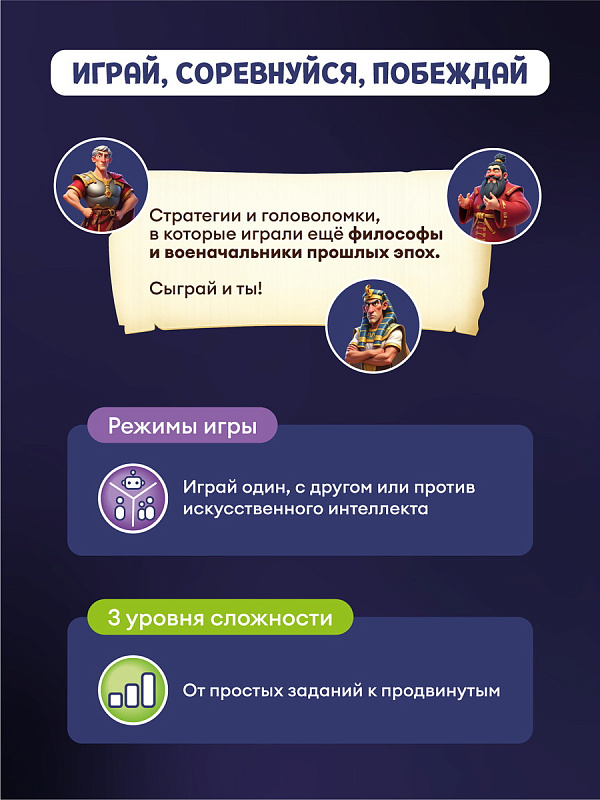 Погрузитесь в мир стратегий и головоломок, путешествуйте по древним цивилизациям и бросайте вызов друзьям или искусственному интеллекту. Всё, что нужно – выбрать игру и начать играть!