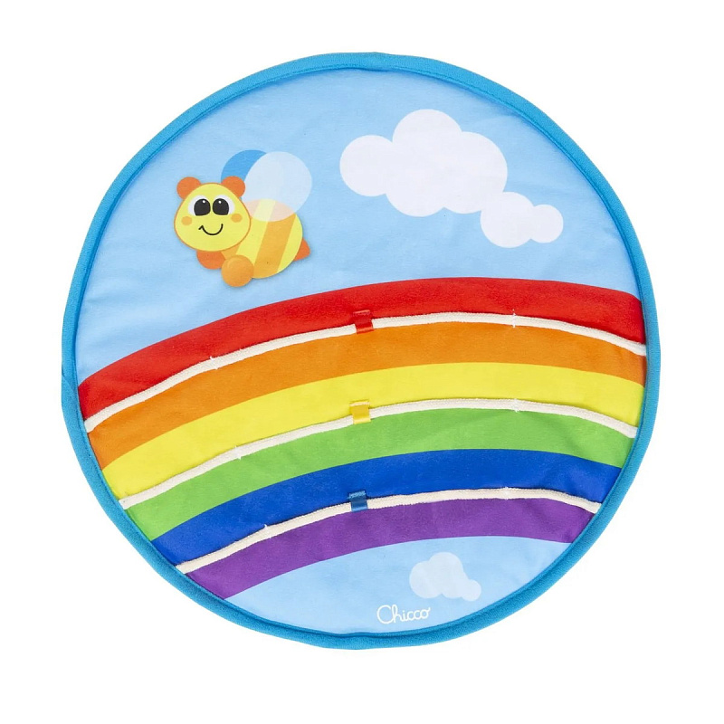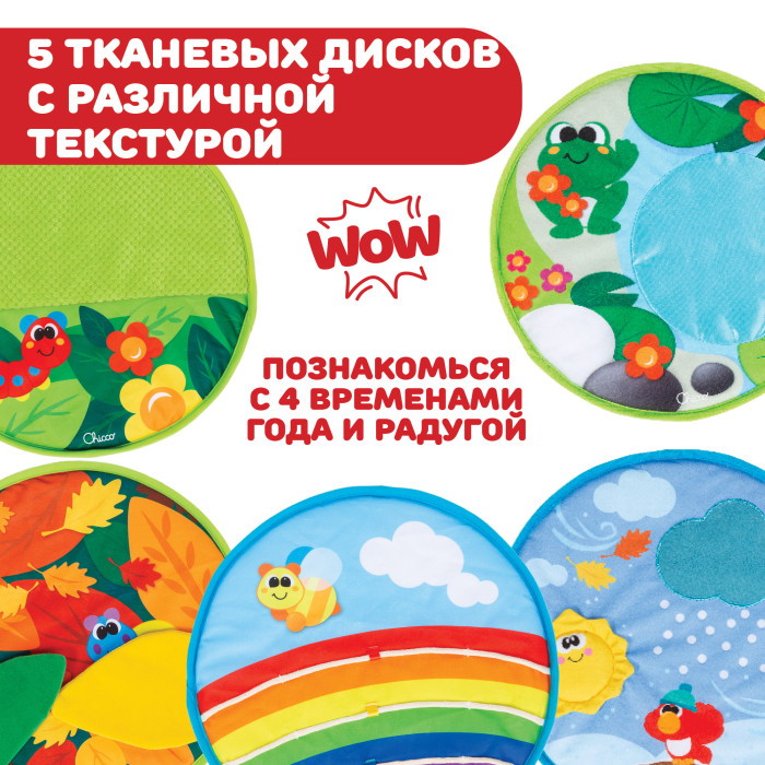 - 5 тканевых дисков (4 сезона и 1 радуга): каждый диск характеризуется особой поверхностью, которая помогает ребенку развить определенные навыки. С дисками можно создать более 10 конфигураций