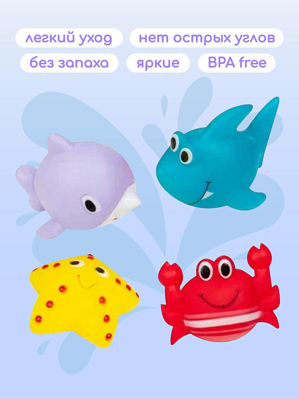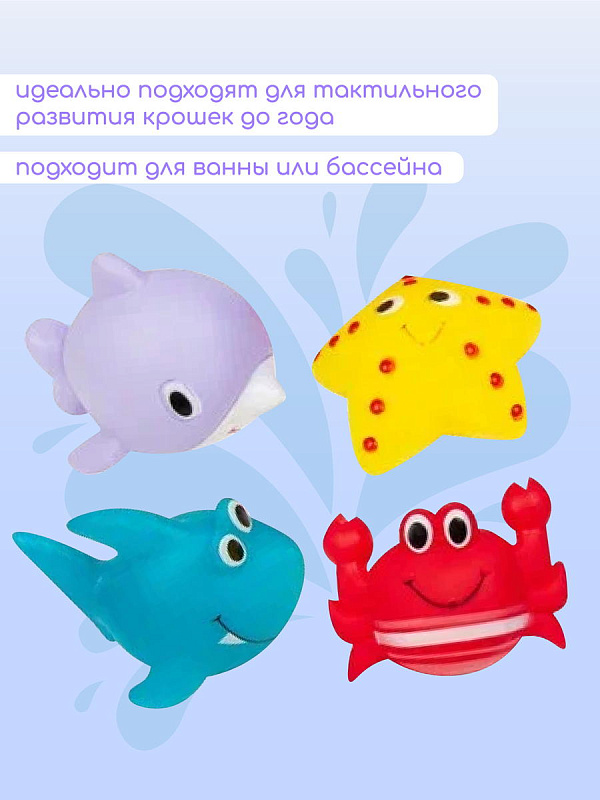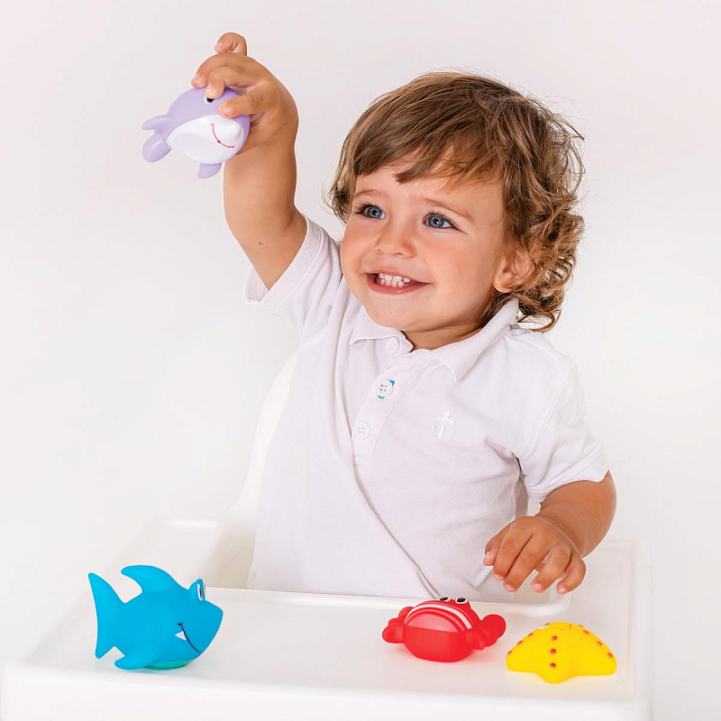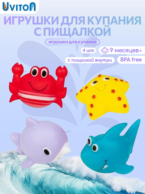 Игрушки для ванны "Ocean" от Uviton – это четыре разноцветных и ярких фигурки в виде: акулы, дельфина, краба и морской звездочки, которые сделают процесс купания Вашего малыша весёлым, увлекательным и обучающим!