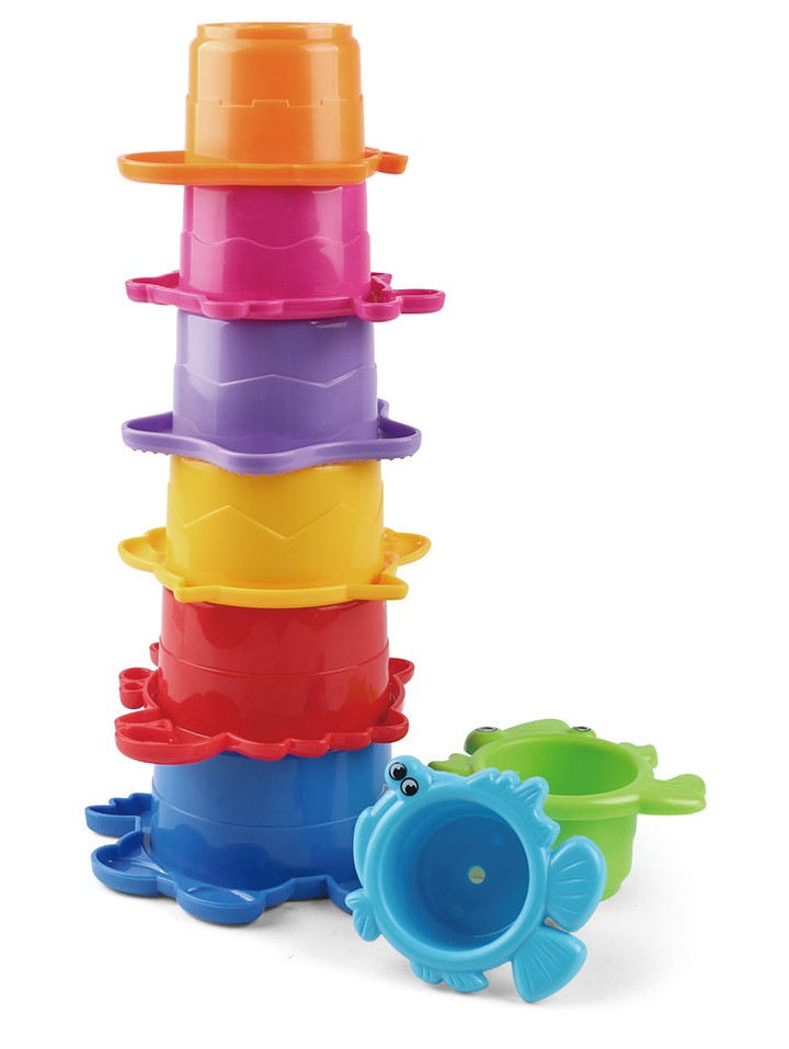 С такой необычной пирамидкой ребенок сможет играть в разнообразные игры. Она состоит из стаканчиков разных размеров и цветов в виде морских животных. Изготовлена из качественного материала.