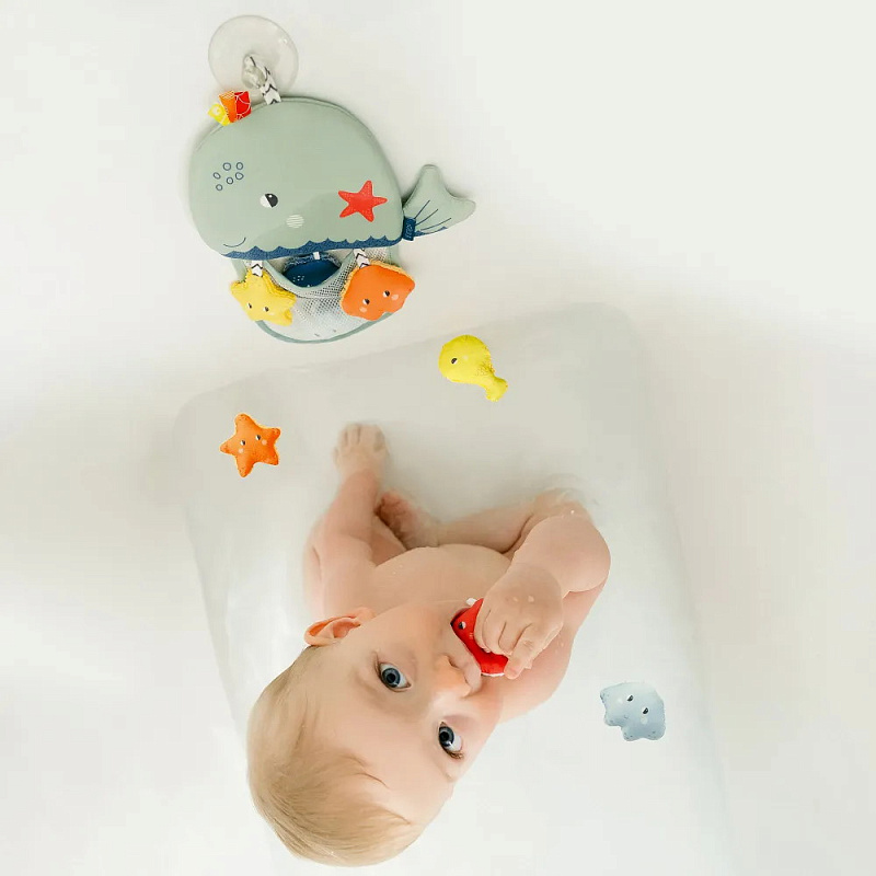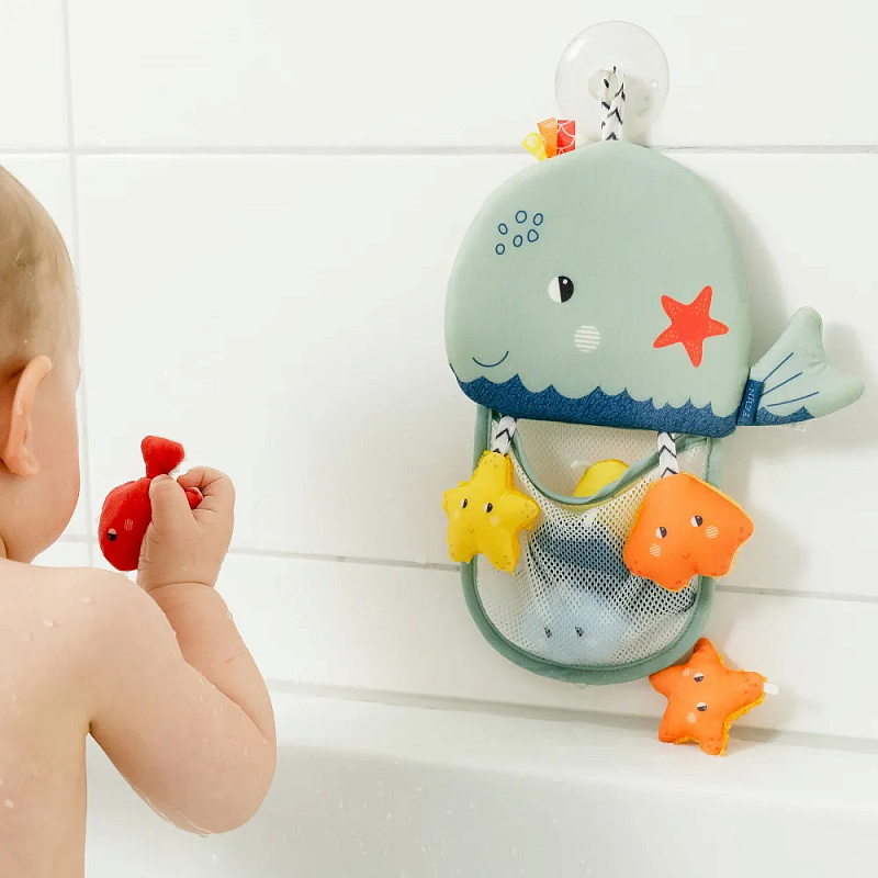 Кит – идеальный компаньон для купания: просто прикрепите органайзер к стенке ванны с помощью присоски, и малышу будет интересно складывать в сетку маленькие игрушки.
