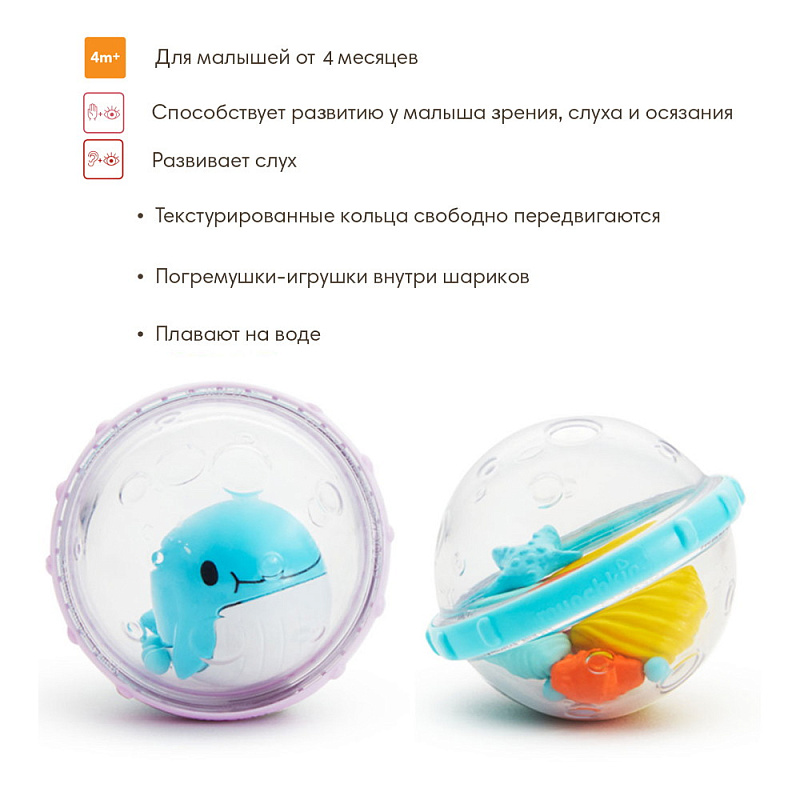 Пузыри-поплавки радуют малыша забавными фигурками и звуками - потому что пузыри в ванной должны быть веселыми! Ваш малыш любит погремушки, шарики, вращалки и блестяшки? Тогда ему будет очень весело играть с пузырями Munchkin в ванной. Шарики имеют внутри уникальные игрушечные фигурки, служат погремушками, блестят и вращаются. Игрушки по размеру очень подходят для маленькой детской руки и помогает развивать координацию рук и зрения у ребенка, когда он старается ее рассмотреть, понять, что находится и происходит у нее внутри и встряхивает.