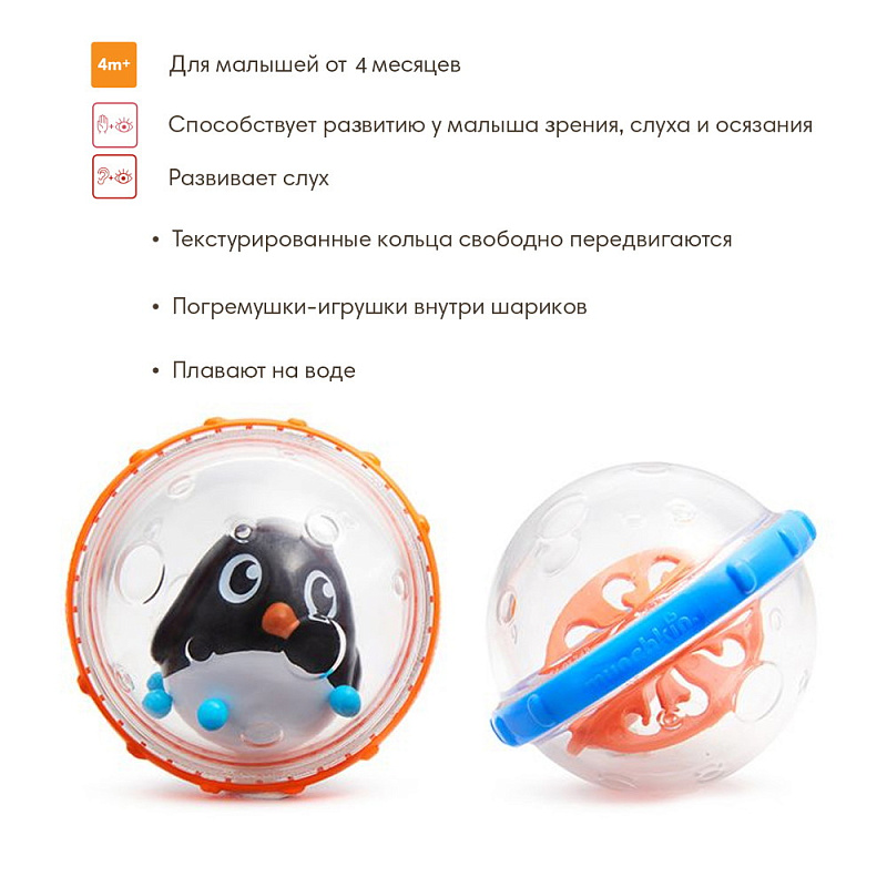 Пузыри-поплавки радуют малыша забавными фигурками и звуками - потому что пузыри в ванной должны быть веселыми! Ваш малыш любит погремушки, шарики, вращалки и блестяшки? Тогда ему будет очень весело играть с пузырями Munchkin в ванной. Шарики имеют внутри уникальные игрушечные фигурки, служат погремушками, блестят и вращаются. Игрушки по размеру очень подходят для маленькой детской руки и помогает развивать координацию рук и зрения у ребенка, когда он старается ее рассмотреть, понять, что находится и происходит у нее внутри и встряхивает.