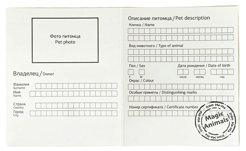 Комплектация: соска-кость, паспорт животного, карточки по уходу