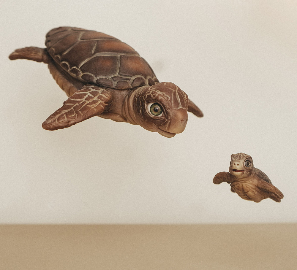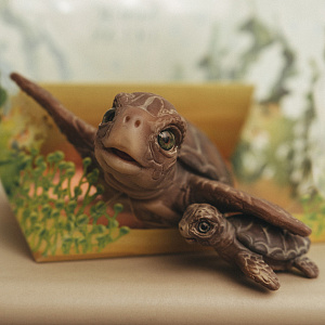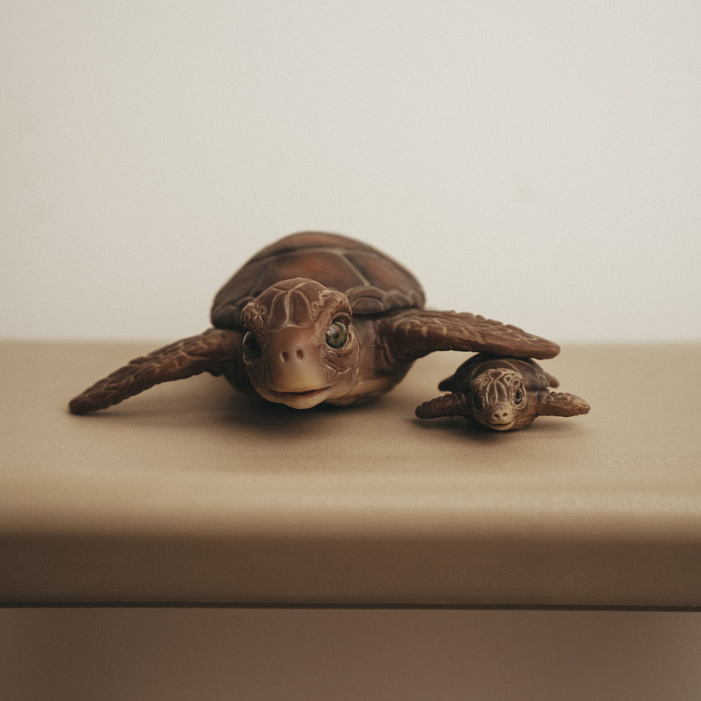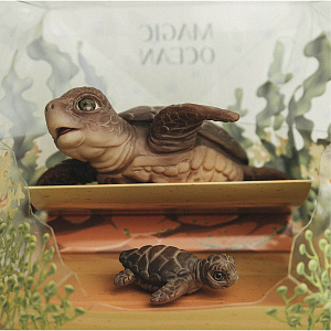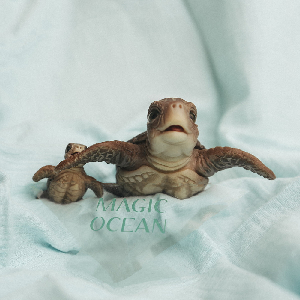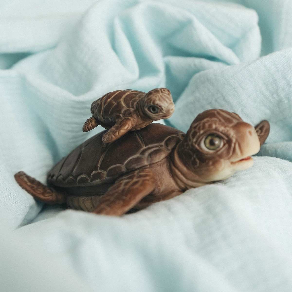 На тёплом мелководье мама-черепаха мягко подталкивает малыша к первому заплыву — спокойные движения и любопытные взгляды создают ощущение живой сцены из океана. Компактный дуэт легко помещается на ладони и моментально настраивает на добрую игру.