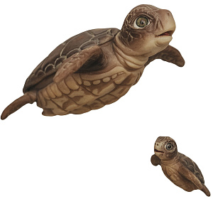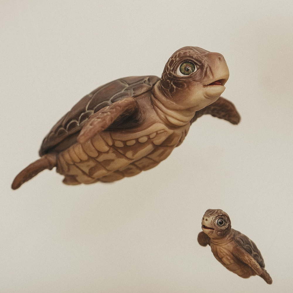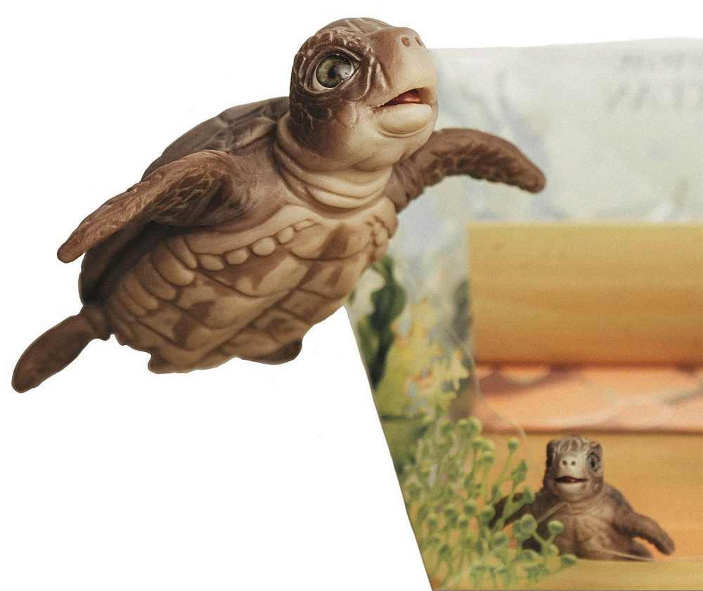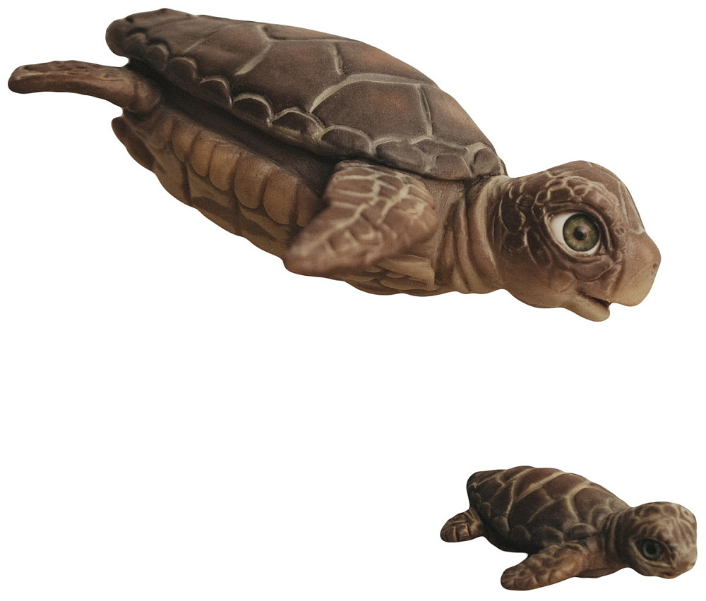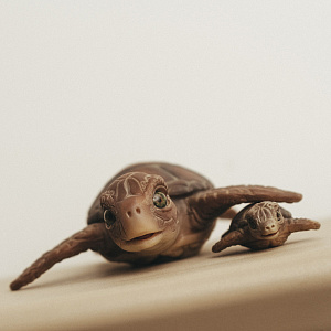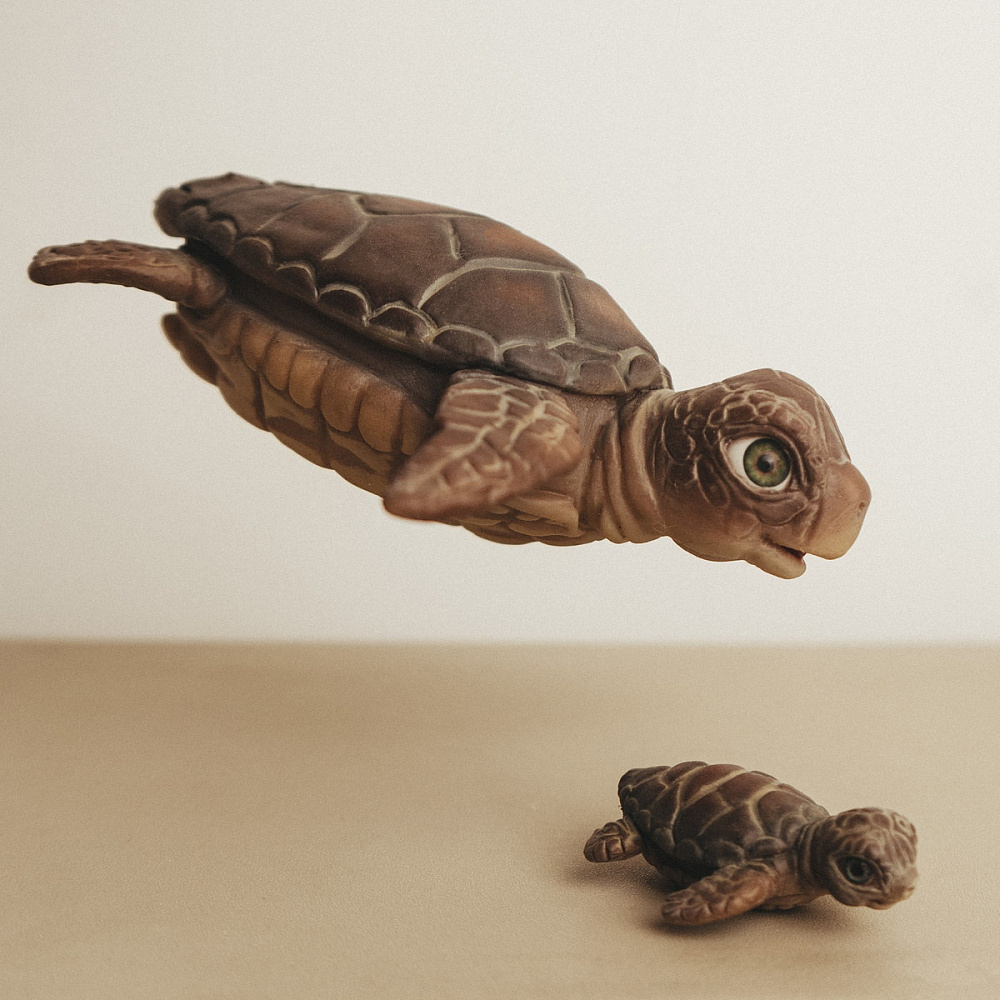 На тёплом мелководье мама-черепаха мягко подталкивает малыша к первому заплыву — спокойные движения и любопытные взгляды создают ощущение живой сцены из океана. Компактный дуэт легко помещается на ладони и моментально настраивает на добрую игру.