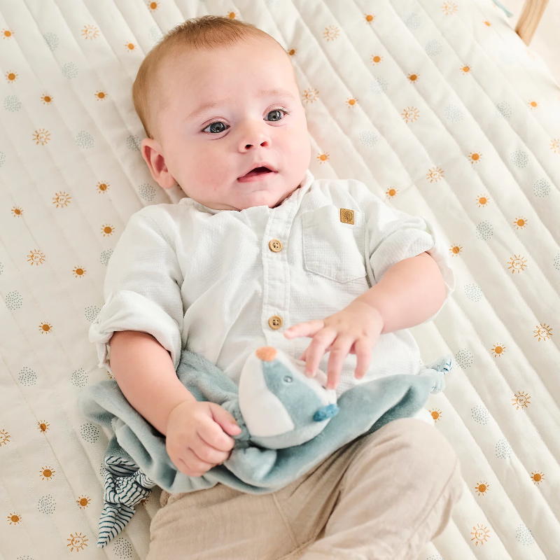 - идеально подходит для новорождённых, станет постоянным другом для малыша дома в кроватке или в коляске на прогулке;