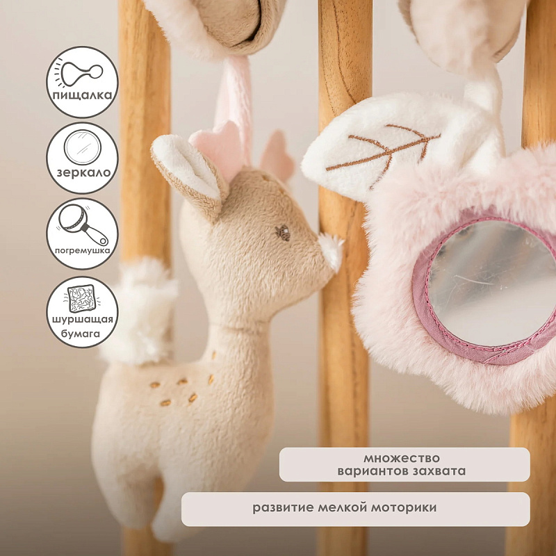 Легко крепится к манежу, кроватке или автокреслу с помощью лент.