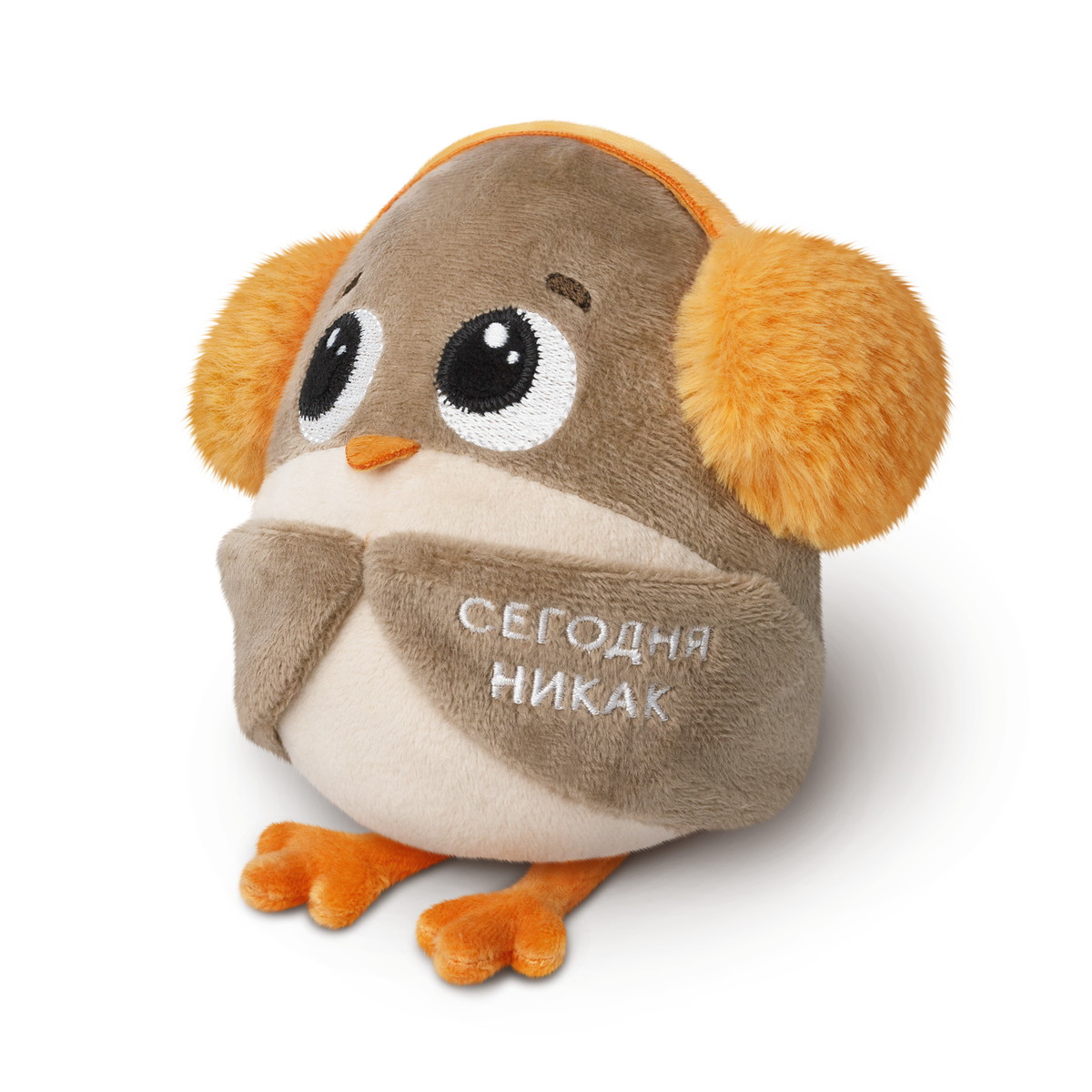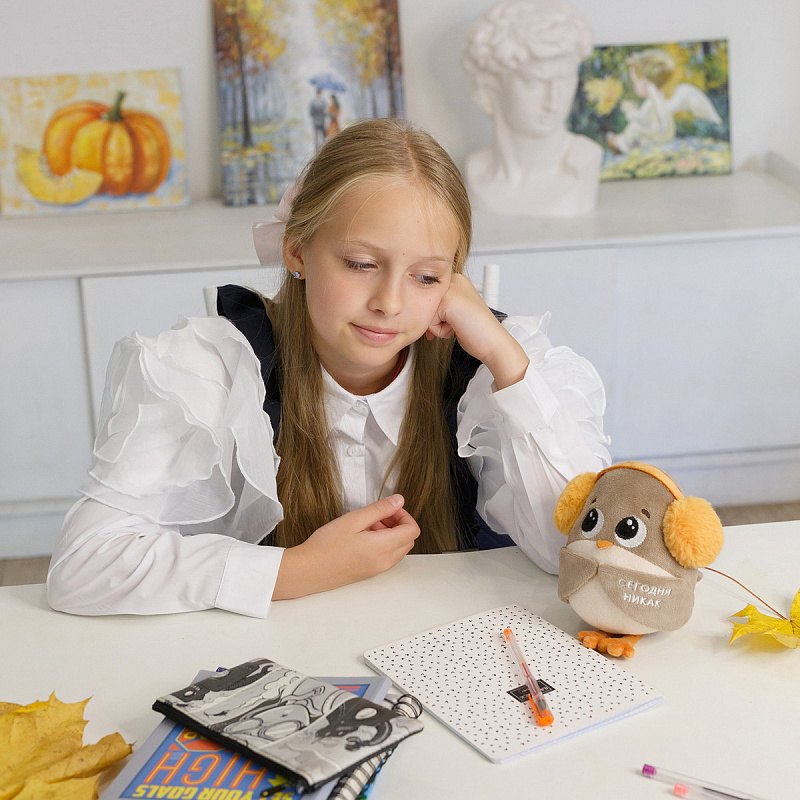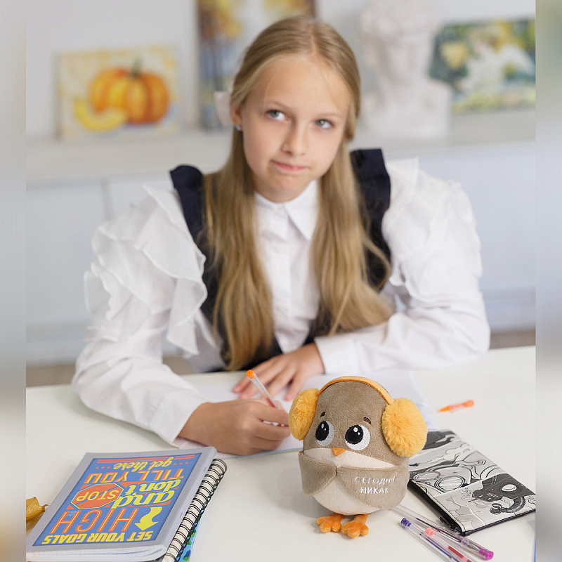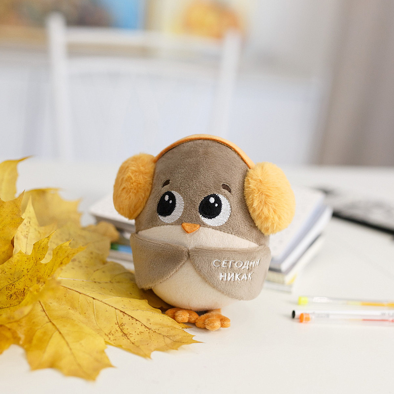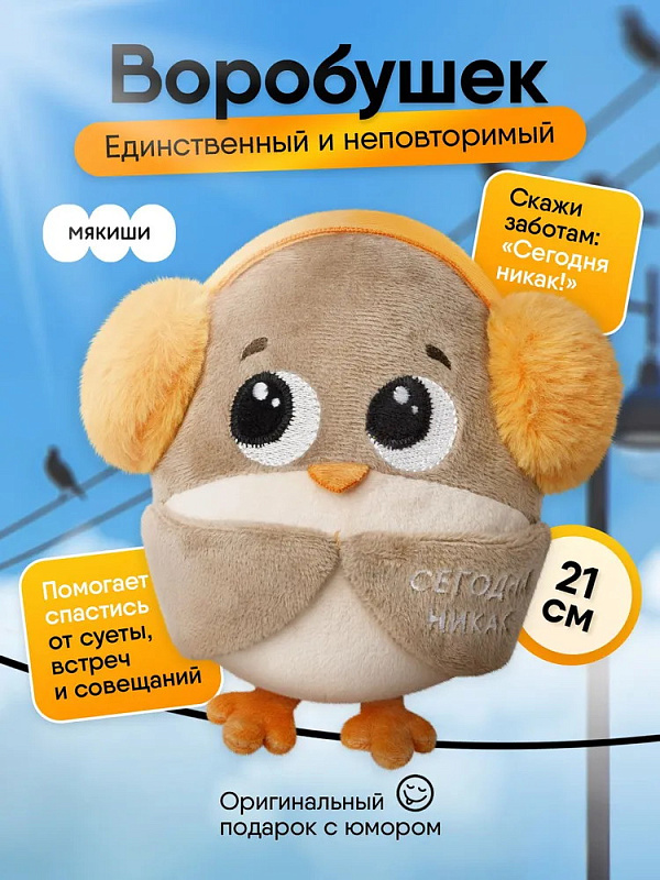 Мягкая игрушка Воробушек-социофобушек с надписью Мягкая игрушка Воробушек-социофобушек — прикольная мягкая игрушка с надписью для офиса и отличный подарок подростку, мужчине, девушке. Воробушек-социофобушек — это милый персонаж, который символизирует желание избегать совещаний и оставаться в тишине. Его пушистые наушники и вышитая надпись «сегодня никак» делают его оригинальной игрушкой с надписью, которая отражает отношение к дедлайнам и публичным выступлениям. Эта прикольная мягкая игрушка станет отличным вариантом для девочки-подростка, а также для тех, кто ищет подарок для коллеги, начальника или фрилансера. Воробушек-социофобушек устойчиво сидит и прекрасно украсит как дом, так и рабочий стол в офисе. Если вы хотите найти прикольный подарок для коллеги, начальника или фрилансера, который оценит оригинальность и юмор, Воробушек-социофобушек станет идеальным выбором. Компактный размер и оригинальный дизайн делают его удобным и практичным, а также подарком, который точно вызовет улыбку. Воробушек-социофобушек — это не просто игрушка мем, а настоящая находка для тех, кто любит прикольные мягкие игрушки, значки мемы и оригинальные подарки для взрослых и детей. Размер игрушки 21 см указан с учетом лапок воробушка.