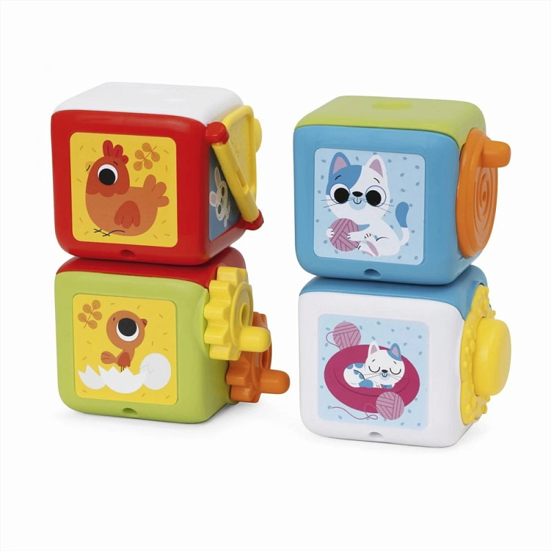 Четыре цветных кубика, наполненных деятельностью, чтобы стимулировать ручные и логические навыки ребенка. Эволюционная игра, чтобы сопровождать ребенка через различные этапы роста.