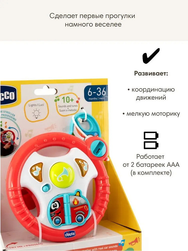 Развивающая игрушка-подвеска Chicco Руль на коляску для малышей от 6 месяцев до 3 лет сделает первые прогулки намного веселее.