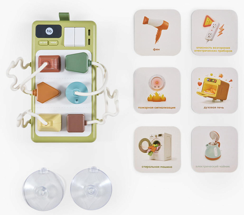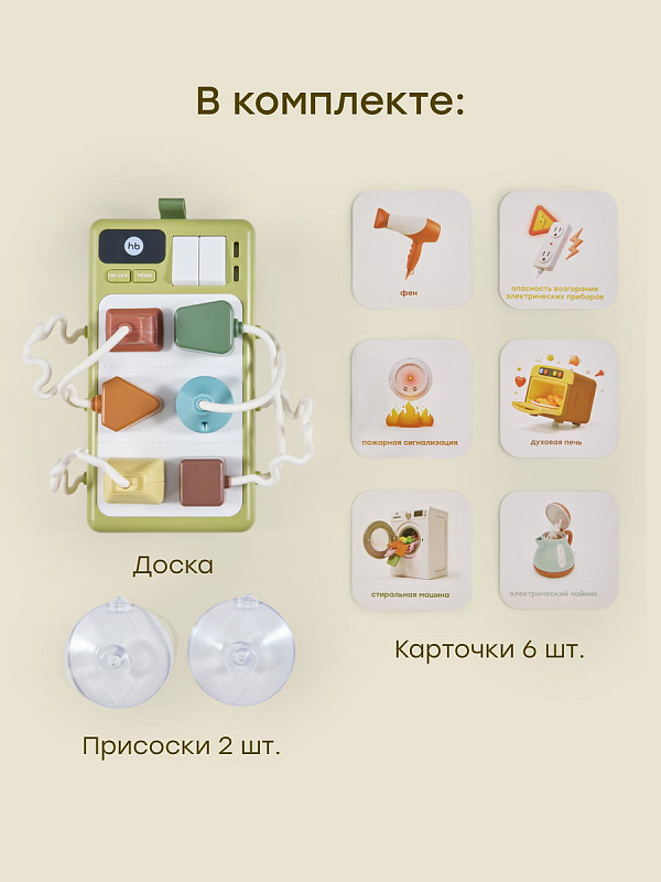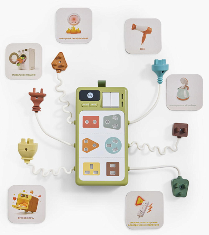 Звуковые эффекты - каждая розетка издаёт звук и мелодии, помогая развивать ассоциативное мышление. В комплект игрового набора входит 6 тематических карточек с изображениями бытовых приборов и их названиями, что способствует развитию ассоциативного мышления и речевых навыков.
