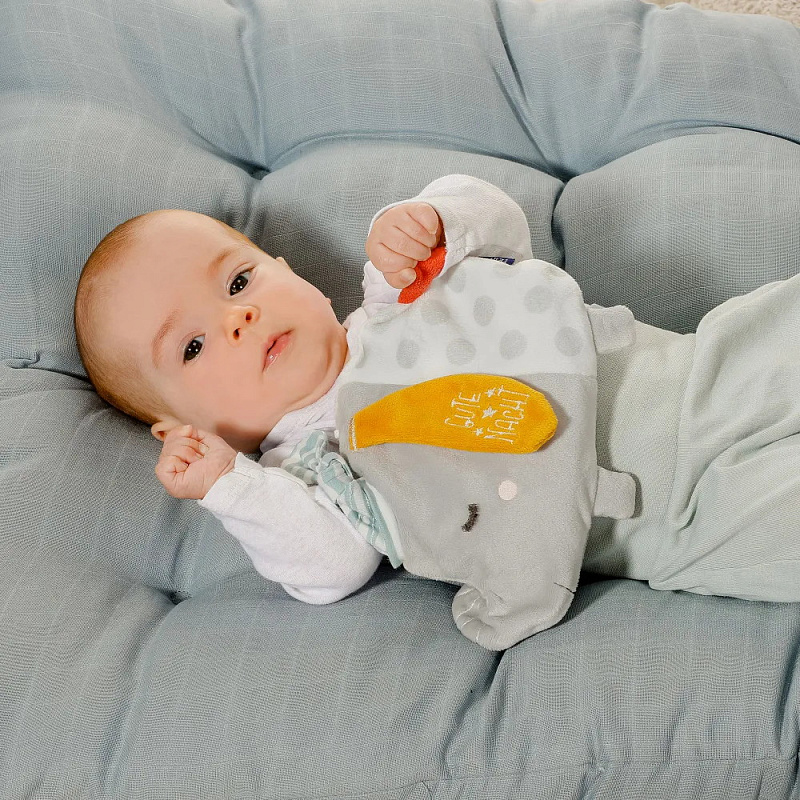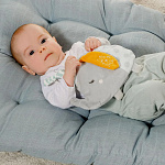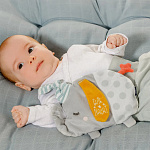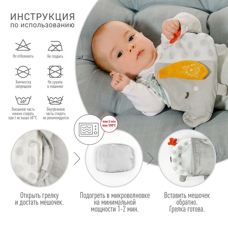 Внутри игрушки есть мешочек с виноградными косточками, который легко достать, расстегнув липучку. Если разогреть мешочек в духовке, то игрушка превратится в грелку. Положите её на животик малыша, чтобы облегчить состояние при коликах. Если же нужно сделать холодный компресс, например при ушибах, то мешочек с виноградными косточками нужно охладить.