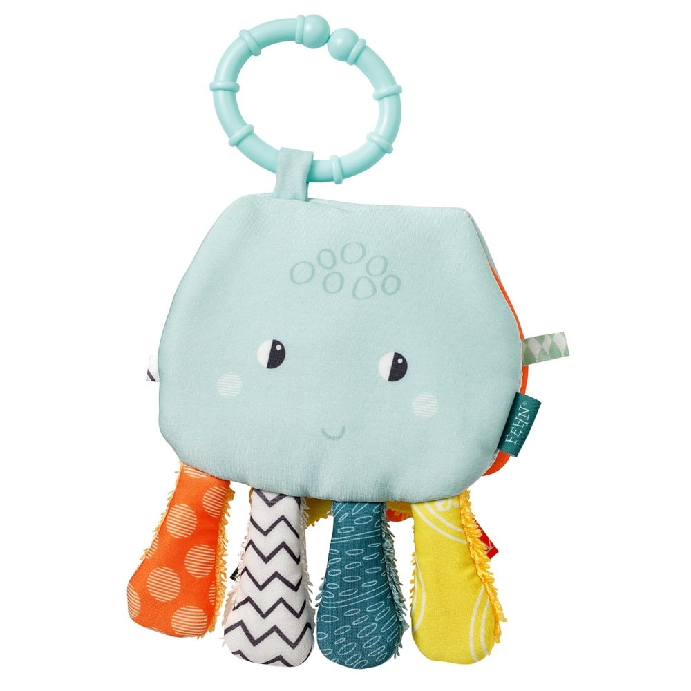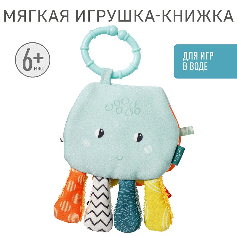 Красочная книжка в виде забавного осьминога выполнена из водонепроницаемого неопрена и подходит для игр во время купания. За удобное колечко её можно подвесить в манеж, кроватку, коляску или прицепить к развивающему коврику.