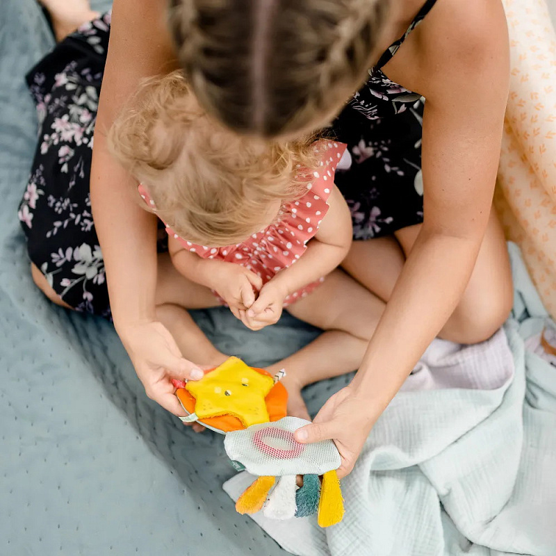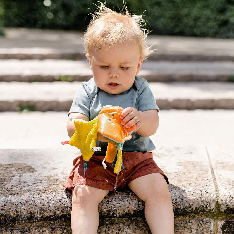 Яркие занимательные детали заинтересуют малыша, ему понравится перелистывать страницы, рассматривать, щупать и мять. Спрятанное колечко для прорезывания зубов, звездочка-погремушка, безопасное зеркальце и шуршащие щупальца осьминога стимулируют сенсорное развитие и мелкую моторику ребенка.