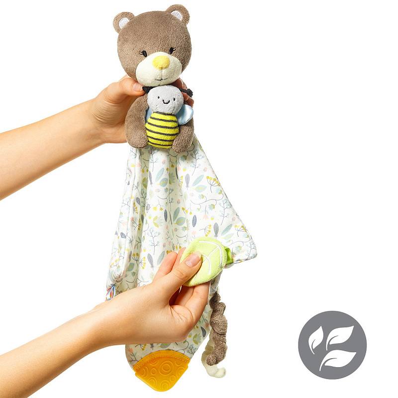 - Мягкий силиконовый прорезыватель, приложенный к игрушке, успокаивает раздраженные десны во время прорезывания зубов.
