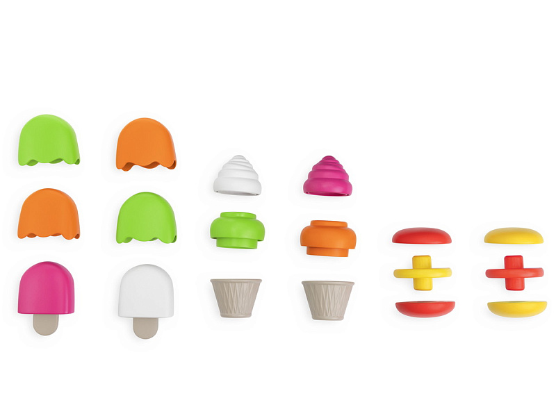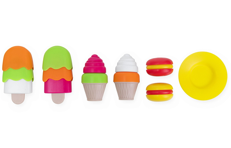 Собирайте сладости по-своему! Составляйте десерты, соединяя элементы друг с другом. Процесс приготовления и подачи мороженого стимулирует воображение и развивает социальные навыки. В комплекте 19 предметов: 2 рожка, 4 вкуса мороженого, 2 палочки для мороженого, 3 печенья макарон, 2 начинки и 1 блюдце.