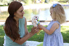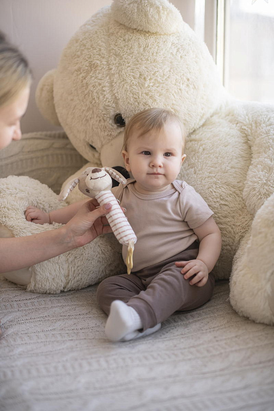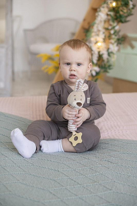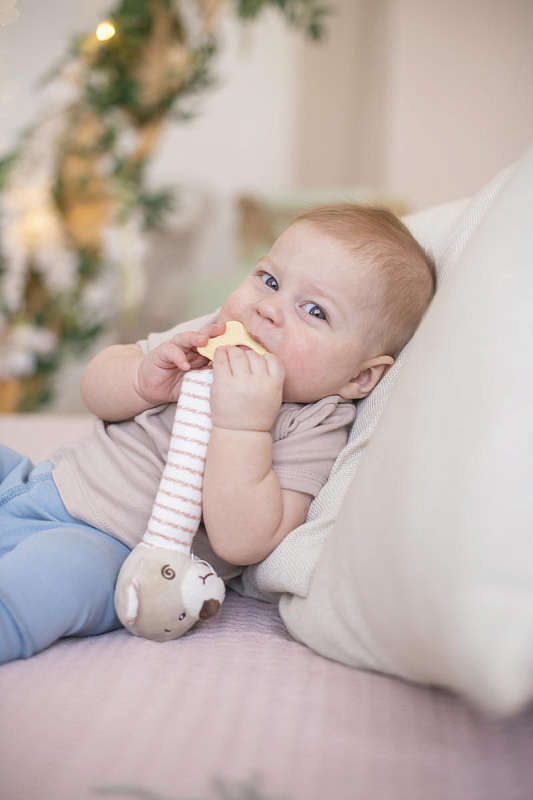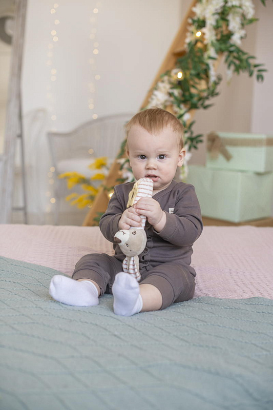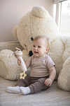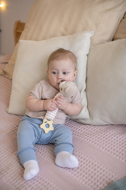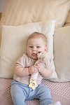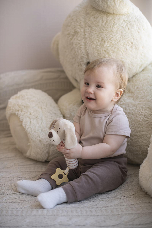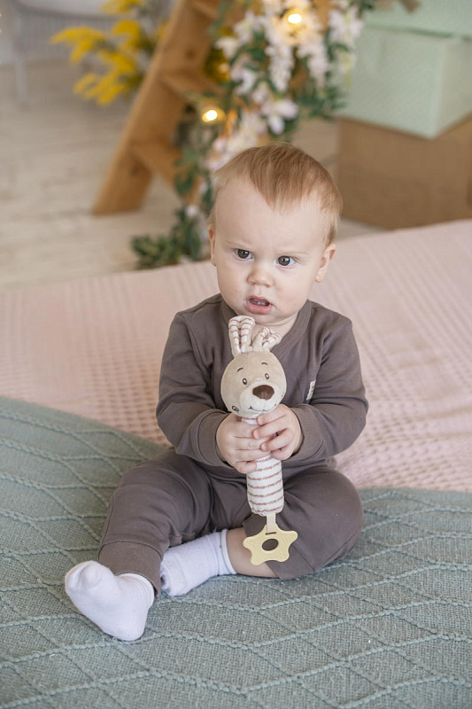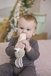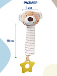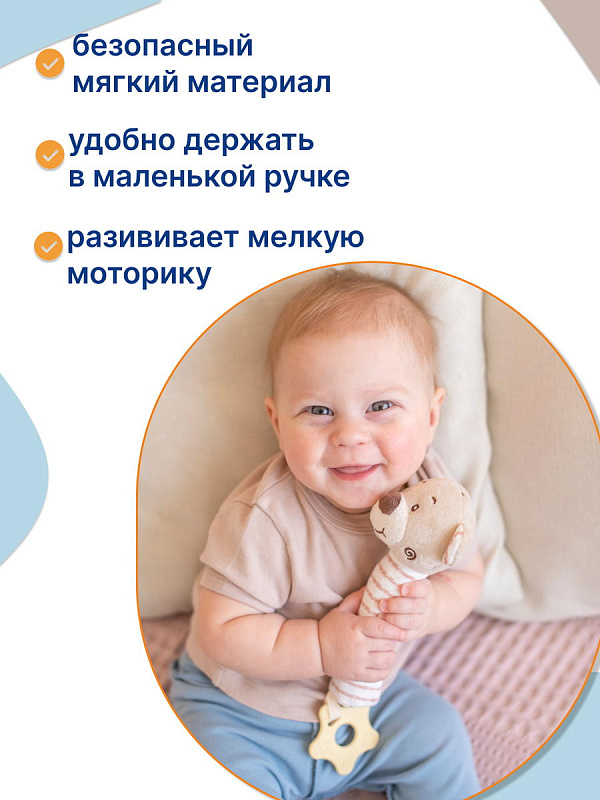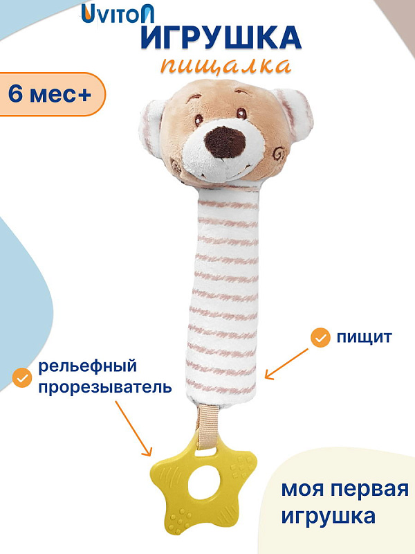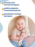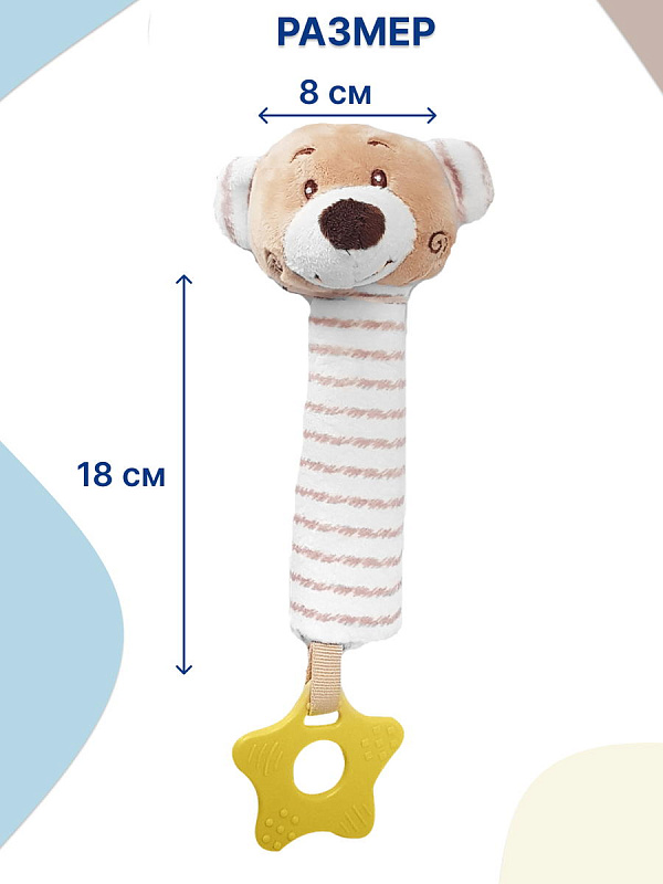 Благодаря своей легкости и эргономичной форме игрушка удобно ложится в маленькую ручку малыша. Мягконабивное тельце приятно на ощупь. При нажатии на него - игрушка пищит. В основании к игрушке прикреплен прорезыватель в виде звездочки. Рельефная поверхность поможет при прорезывании зубов. Все детали выполнены без острых углов и не могут навредить ребенку.