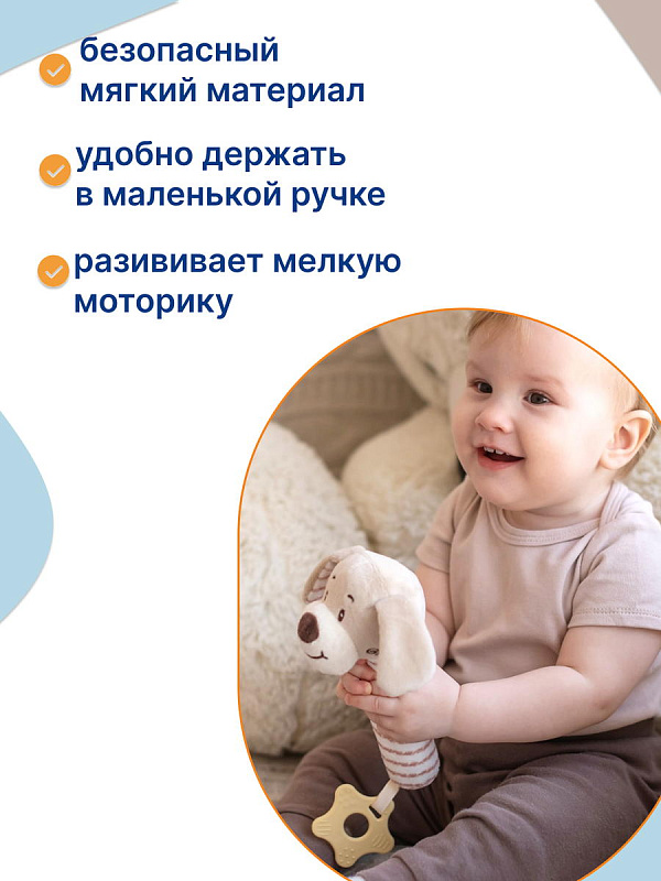 Благодаря своей легкости и эргономичной форме игрушка удобно ложится в маленькую ручку малыша. Мягконабивное тельце приятно на ощупь. При нажатии на него - игрушка пищит. В основании к игрушке прикреплен прорезыватель в виде звездочки. Рельефная поверхность поможет при прорезывании зубов. Все детали выполнены без острых углов и не могут навредить ребенку.