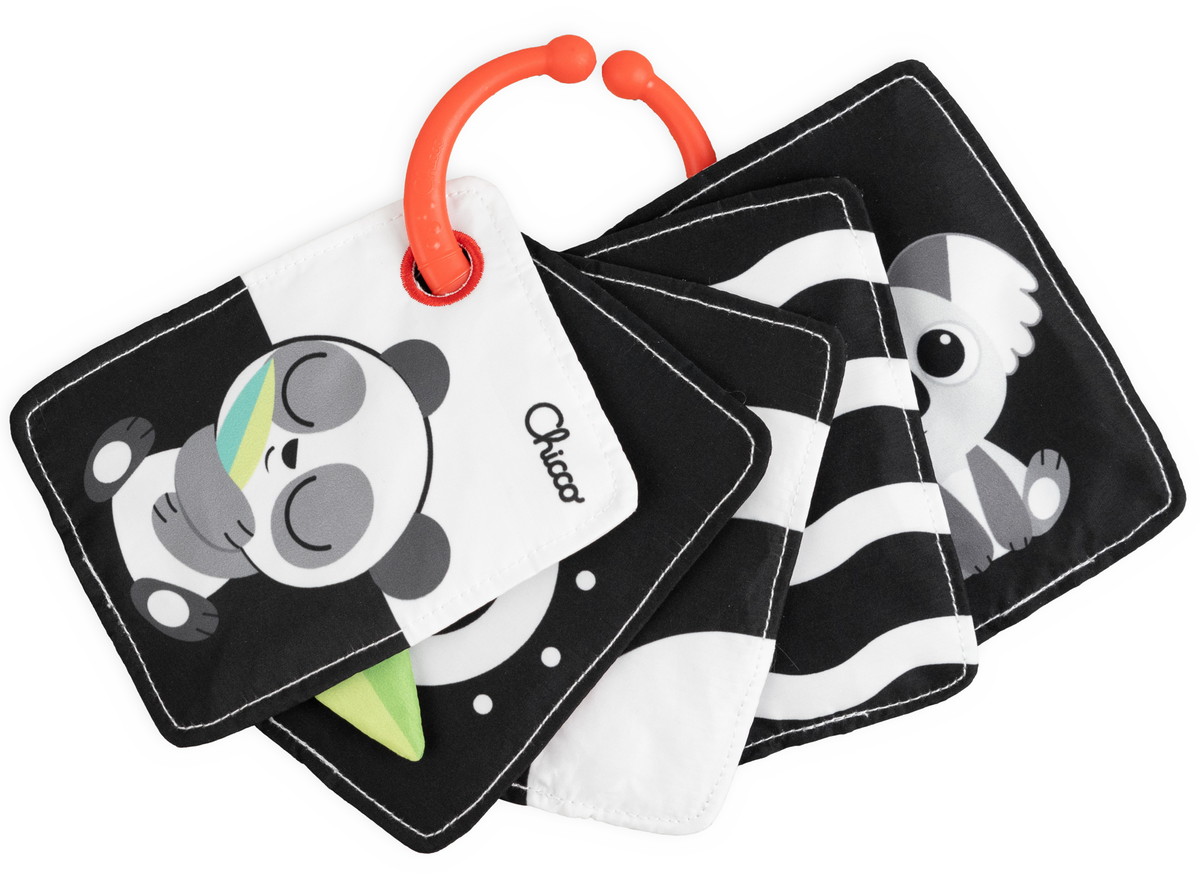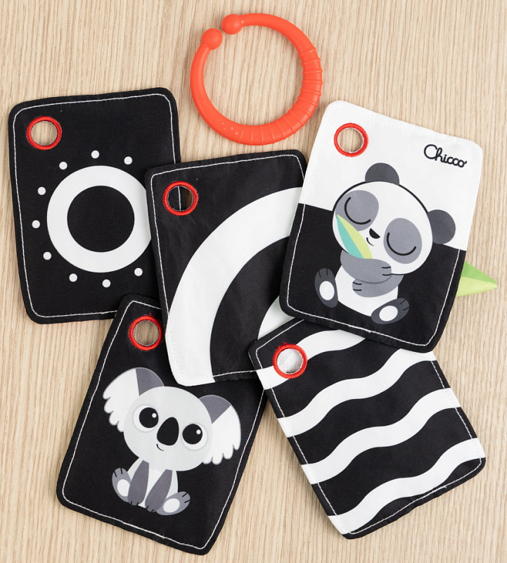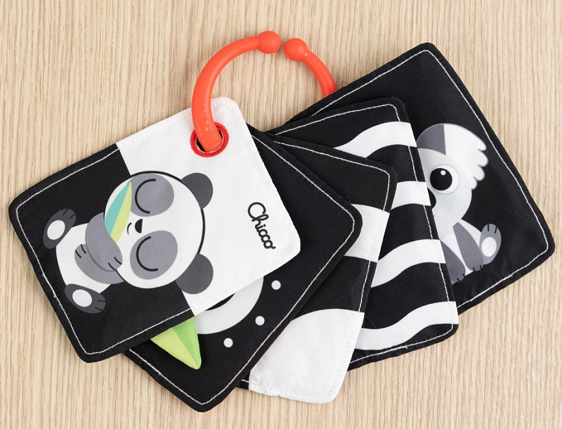 Одна из сторон карточек выполнена в чёрно-белой гамме. Такой контраст особенно полезен для малышей в первые месяцы жизни, когда зрение только формируется: чёткие контуры и простые цвета легче воспринимаются и помогают развивать концентрацию внимания и фокусировку взгляда.