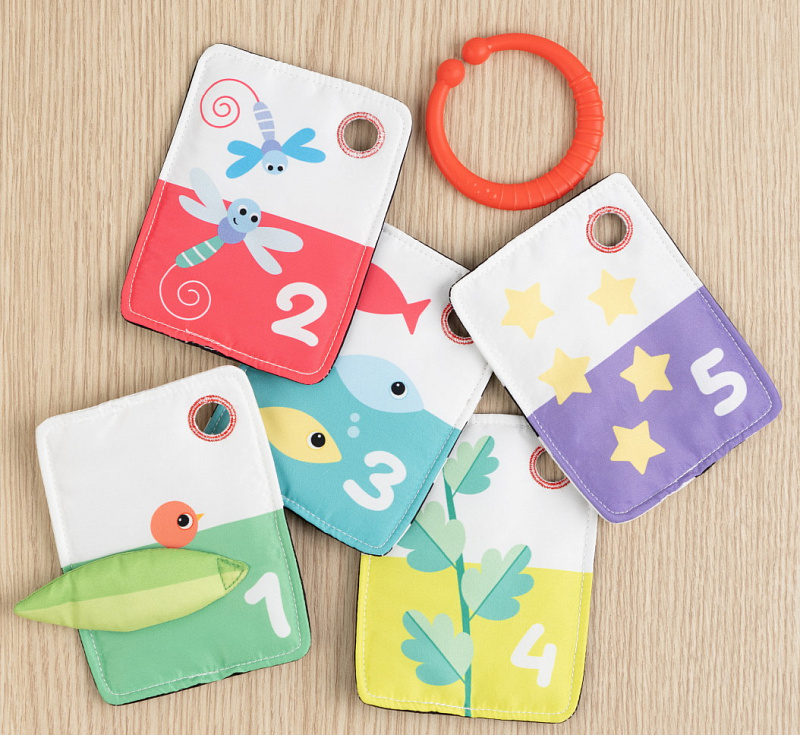 Подвеска помогает в игровой форме познакомиться с цифрами от 1 до 5. Перелистывая мягкие карточки, ребёнок учится считать, рассматривать изображения и узнавать, кто спрятался за следующим листиком. Элемент «переверни карточку» превращает игру в увлекательное открытие и поддерживает интерес малыша.