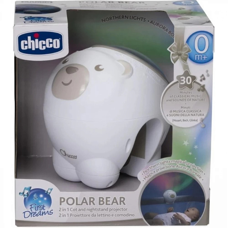 Игрушка-проектор Chicco "Полярный мишка"Проектор северного сияния Полярный мишка от Chicco для малышей с рождения создаст волшебную атмосферу в спальне и поможет уснуть.