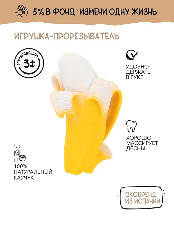 Выполненный из 100% натурального каучука (из сока дерева гевеи), прорезыватель хорошо успокаивает дёсны. Цвет и фактура стимулируют сенсорное развитие ребёнка.