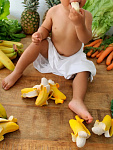 Каучуковые игрушки-прорезыватели в виде овощей и фруктов помогут приобщить детей к здоровому образу жизни с раннего возраста.