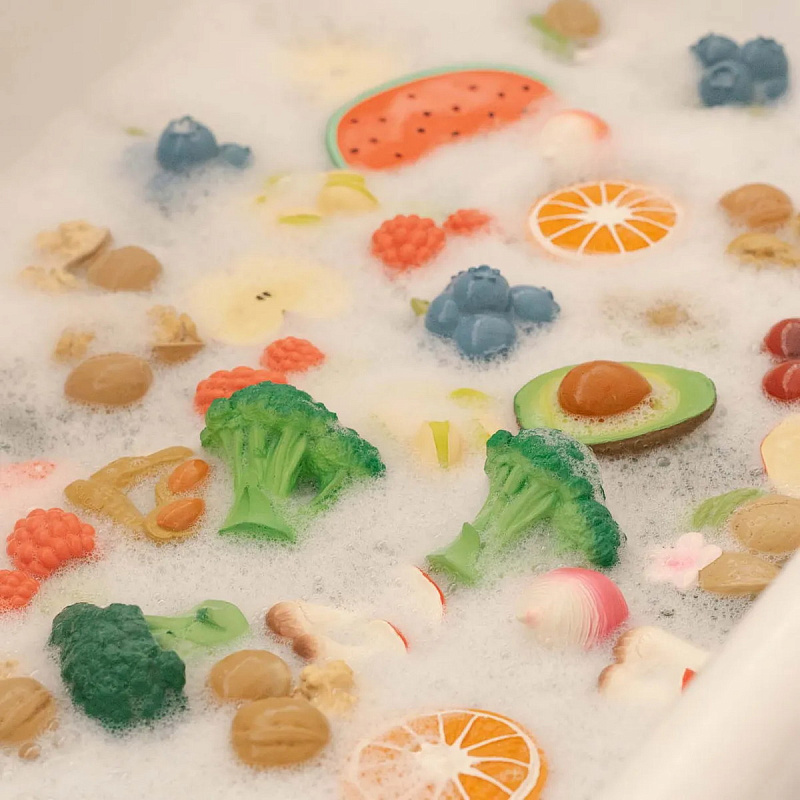 Каучуковые игрушки-прорезыватели в виде овощей и фруктов помогут приобщить детей к здоровому образу жизни с раннего возраста.
