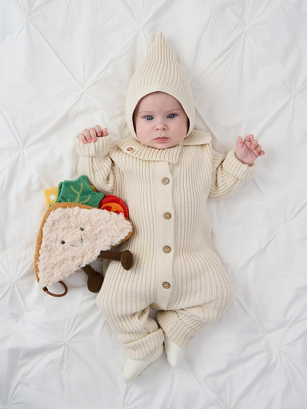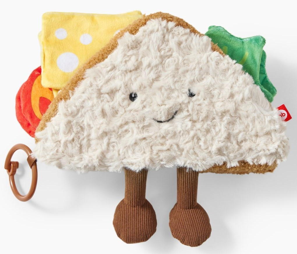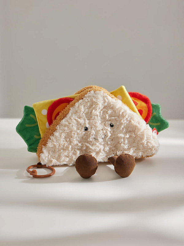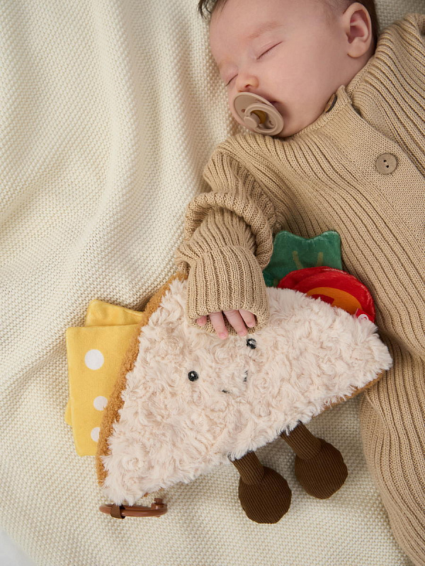 Данная игрушка напоминает сэндвич и обладает интересными шуршащими эффектами, которые привлекут внимание малыша. Игрушка выполнена в светлом молочном цвете, что делает ее привлекательной для маленьких детей. Кроме того, она легкая и удобная для длительных игровых сессий.