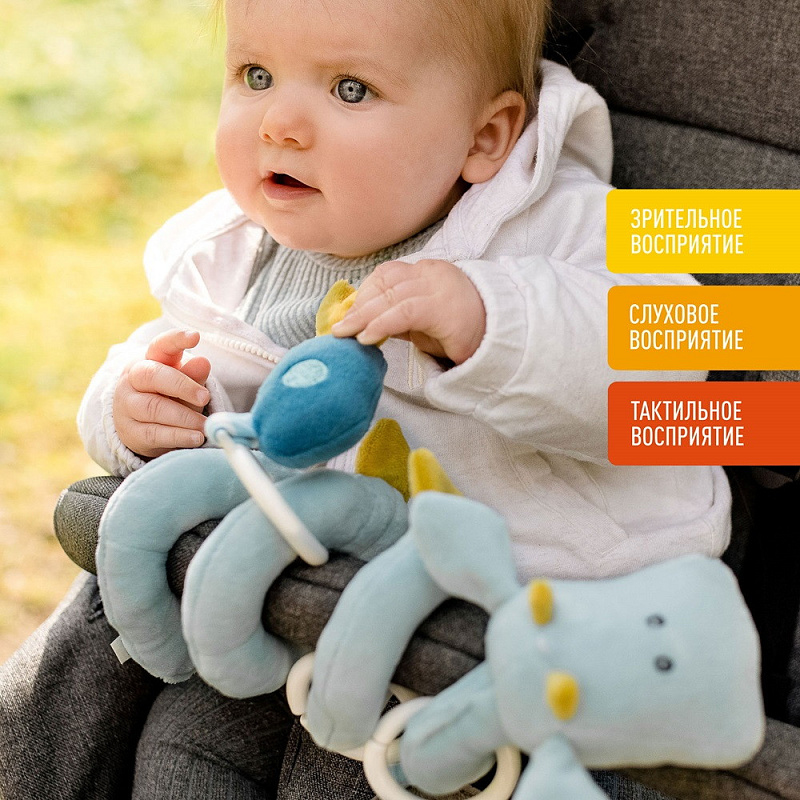 Очаровательный дракончик, выполненный в виде длинной текстильной спирали с подвесными мягкими игрушками. Идеально подходит для кроватки и манежа, коляски или автокресла.