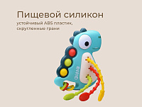 Интерактивная игрушка в форме динозаврика имеет разные элементы, которые способствуют развитию моторики, координации движений и сенсорного восприятия у ребенка.