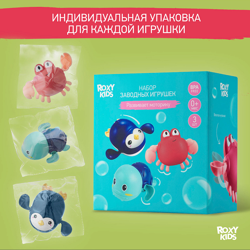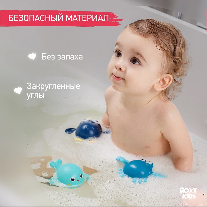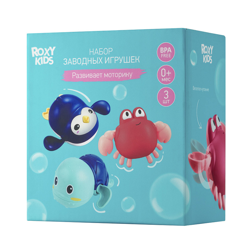 Отправьтесь в мир веселых водных приключений с набором заводных игрушек для ванны от ROXY-KIDS. Набор из 3-х игрушек идеально подойдет для купания в ванной, игр в бассейне или на пляже. Лапки игрушек вращаются на 360 градусов. Игрушки работают без батареек благодаря заводному механизму. Чтобы запустить игрушку, поверните механизм по часовой стрелке до упора и опустите игрушку в воду. Плавающие морские животные развеселят ребенка и поднимут малышу настроение! Благодаря небольшому размеру игрушки удобно держать в детской ручке. Игрушки сделаны из премиального абс-пластика с закругленными краями и абсолютно безопасны для малыша. Позвольте малышу насладиться каждым моментом купания с заводными игрушками от ROXY-KIDS!
