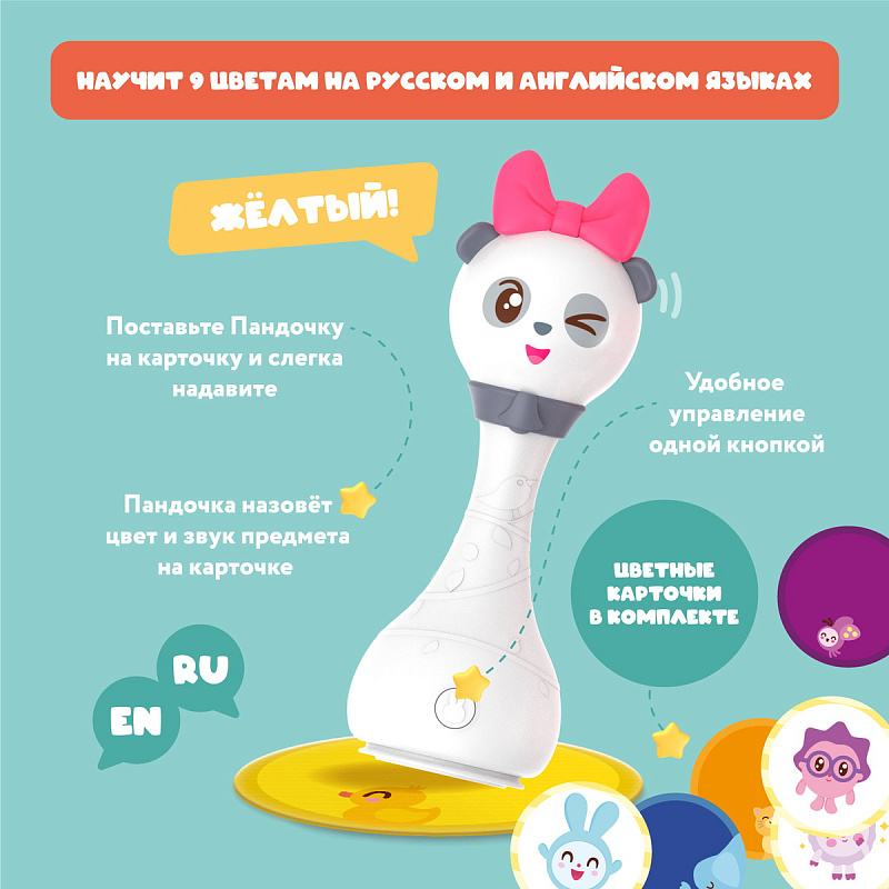 Интерактивная музыкальная игрушка и большой непоседа. Она поёт песенки, рассказывает сказки и учит малыша узнавать цвета. Весь контент от Малышариков, которые так нравятся деткам!