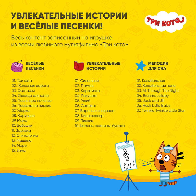 - Певица и чтец. 15 песенок и 10 сказок из «Трёх котов» на борту. И игры ещё.