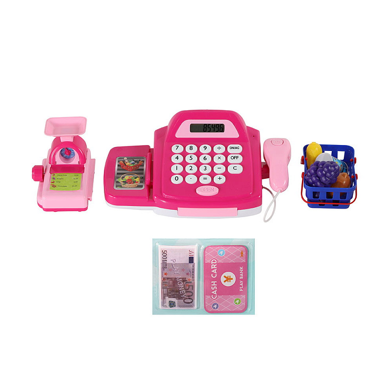 В наборекасса, корзинка для покупок, весы, продукты, игрушечные деньги и кредитная карта.