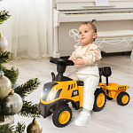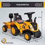- Машинка-трактор имеет прицеп, который можно легко прицепить и отцепить, а также грабли и лопатку для игры в песочнице.