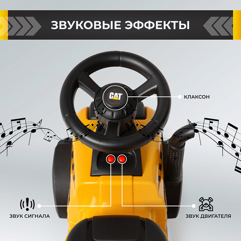 - Звук мотора и звук сигнала* управляются с помощью кнопок на панели под рулем, а также сам руль оснащен звонким клаксоном – пищалкой.