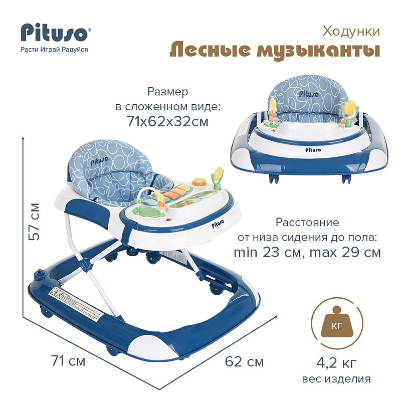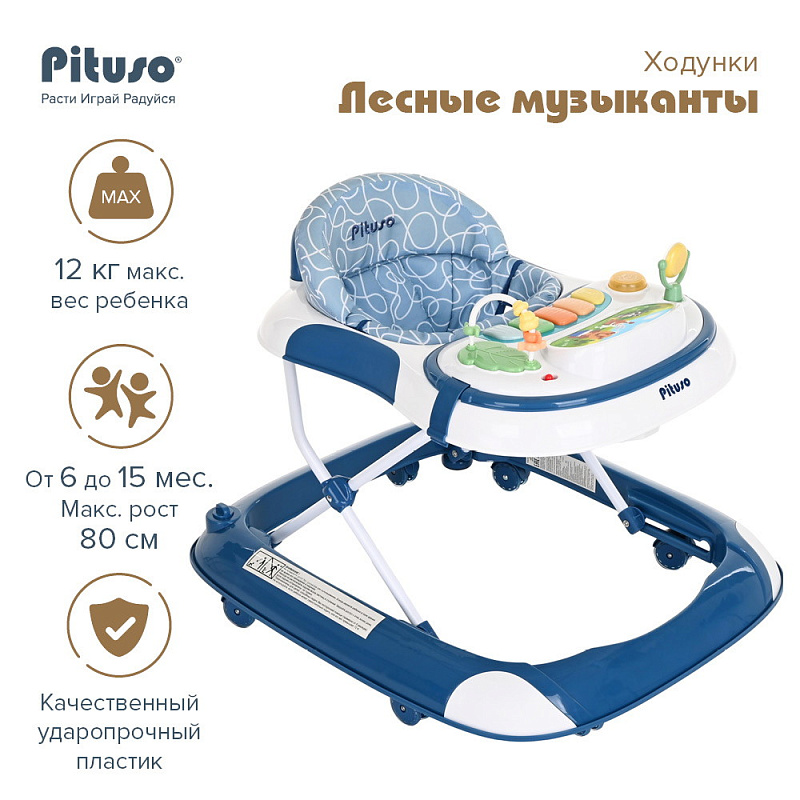 Ходунки PITUSO Лесные музыканты – отличный помощник для подготовки малыша к первым самостоятельным шагам, развивают координацию движений и помогают ребенку научиться держать равновесие. Ходунки легко регулируются в зависимости от роста ребенка, что способствует правильной постановке стопы при передвижении. Эргономичная форма сидения с поддержкой спины обеспечит правильную посадку ребенка. Съемная музыкальная панель с игрушками способствует развитию у малыша мелкой моторики, можно использовать отдельно от ходунков.