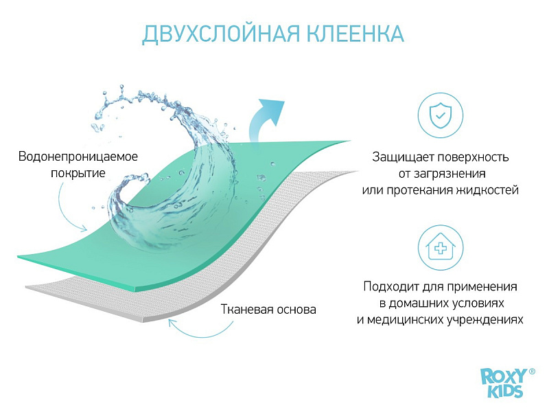Подкладная клеенка для малышей ROXY-KIDS защищает детские матрасы и любую другую поверхность от загрязнения или протекания жидкостей. Она производятся из специальной медицинской клеенки с ПВХ-покрытием. Все клеенки имеют окантовку по периметру. Они обладают отличной теплопроводностью. Специальный покрывающий слой на основе поливинилхлорида делает поверхность пеленок удобной и комфортной, потому что она быстро приобретает температуру человеческого тела. Отсутствует эффект холодного прикосновения, что очень важно в педиатрии. Микропористая структура данного покрытия придает клеенке свойства газопроницаемости. В ассортименте ROXY-KIDS представлено несколько цветов подкладных клеенок.