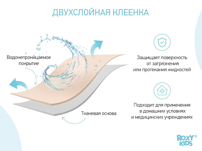 Подкладная клеенка для малышей ROXY-KIDS защищает детские матрасы и любую другую поверхность от загрязнения или протекания жидкостей. Она производятся из специальной медицинской клеенки с ПВХ-покрытием. Все клеенки имеют окантовку по периметру. Они обладают отличной теплопроводностью. Специальный покрывающий слой на основе поливинилхлорида делает поверхность пеленок удобной и комфортной, потому что она быстро приобретает температуру человеческого тела. Отсутствует эффект холодного прикосновения, что очень важно в педиатрии. Микропористая структура данного покрытия придает клеенке свойства газопроницаемости. В ассортименте ROXY-KIDS представлено несколько цветов подкладных клеенок.