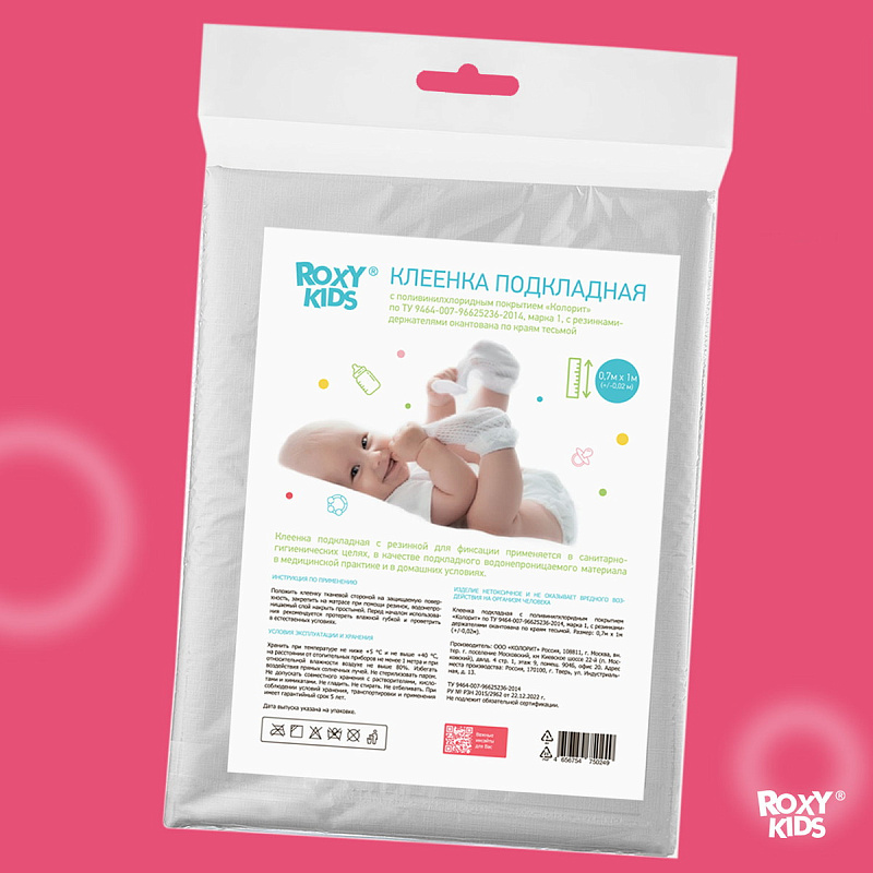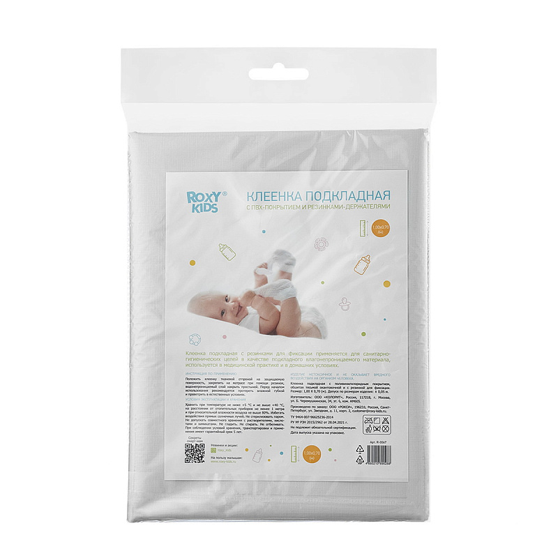 Подкладная клеенка с резинками-держателями защищает матрасы и любую другую поверхность от загрязнения или протекания жидкостей. Удобно крепится к детским матрасам с помощью резинок-держателей. Изделия ROXY-KIDS производятся из специальной медицинской клеенки с ПВХ-покрытием. Все клеенки имеют окантовку по периметру. Они обладают отличной теплопроводностью. Специальный покрывающий слой на основе поливинилхлорида делает поверхность пеленок удобной и комфортной - она быстро приобретает температуру человеческого тела. Отсутствует эффект холодного прикосновения, что очень важно в педиатрии. Микропористая структура данного покрытия придает клеенке свойства газопроницаемости.