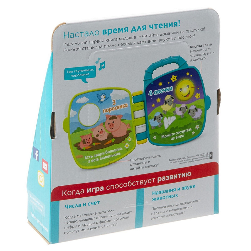 Занимательная книжка-считалочка Infant Toy от Fisher Price станет первой любимой книгой для вашего малыша! Нажмите на кнопку в виде солнышка, включите подсветку и прослушайте звуки, обучающие фразы и песенки. На каждом развороте книги изображены забавные домашние животные – милый теленок, желтые утята, озорные поросята, пушистые овечки и др. Ребенок сможет с ними познакомиться, запомнить их голоса и обучиться счету. Книжка-считалочка порадует малыша яркими страницами и красочным оформлением, а удобная ручка позволит брать ее с собой на прогулку. Музыкальная книга непременно понравится ребенку и он увлекательно проведет время, подражая голосам животных и разучивая веселые песенки.