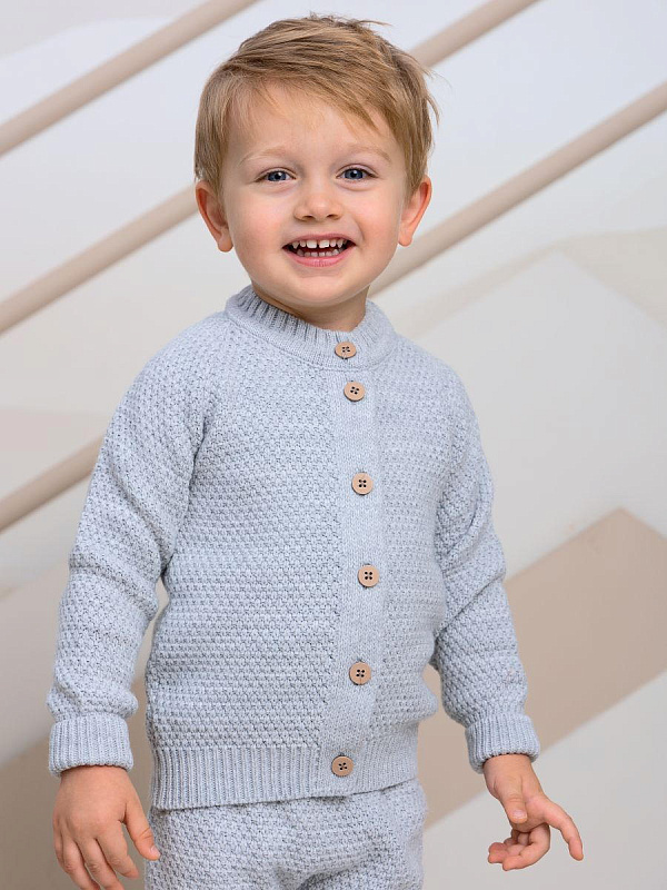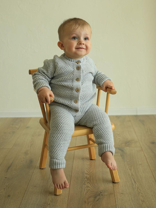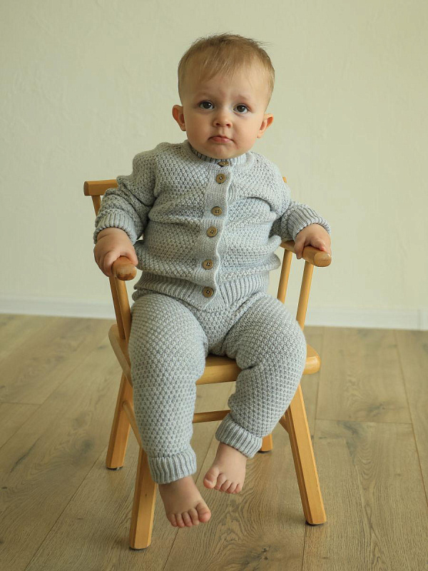 Элегантный комплект из кофточки и штанов для маленьких принцев. Изысканный серый меланж и натуральные материалы делают этот комплект идеальным выбором для повседневной носки.