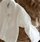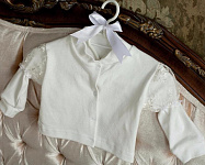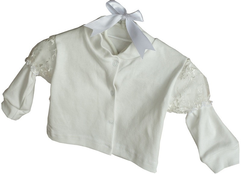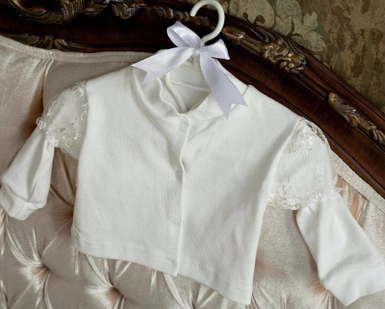 Кофточка с кружевными вставками, выполнена из мягкого к телу трикотажного полотна. Ткань гипоаллергенна, приятная на ощупь. Застегивается на кнопки спереди.