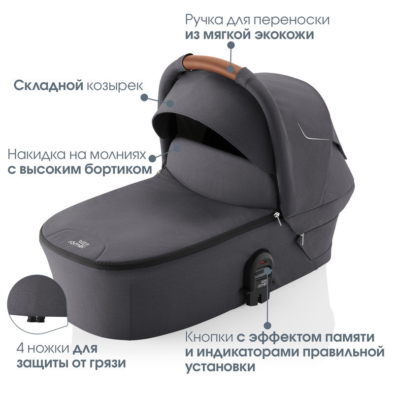 Устанавливается штатным ремнем или на поворотную базу Britax Roemer, а также совместима с большинством прогулочных колясок.