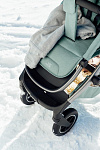 С помощью поворотных передних колёс можно легко маневрировать во время городских прогулок, а для комфортного путешествия по пересеченной местности их можно зафиксировать. Передние колёса с амортизацией компенсируют неровности дороги, поэтому вы можете открывать мир своему малышу, гуляя с ним и по брусчатым мостовым, и по размокшим грунтовым дорогам.