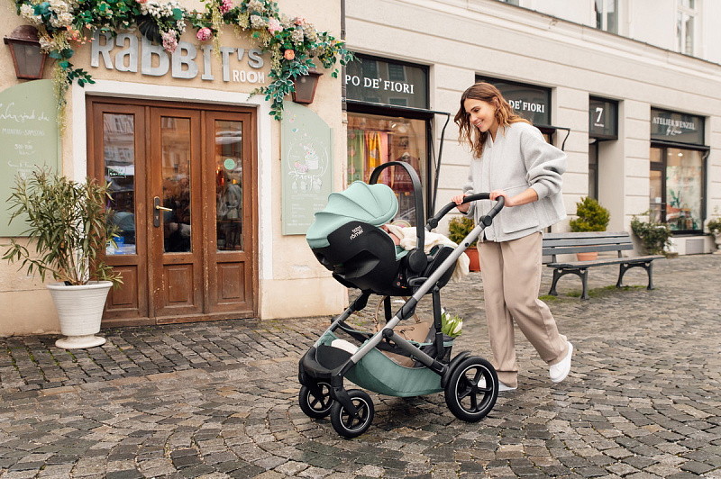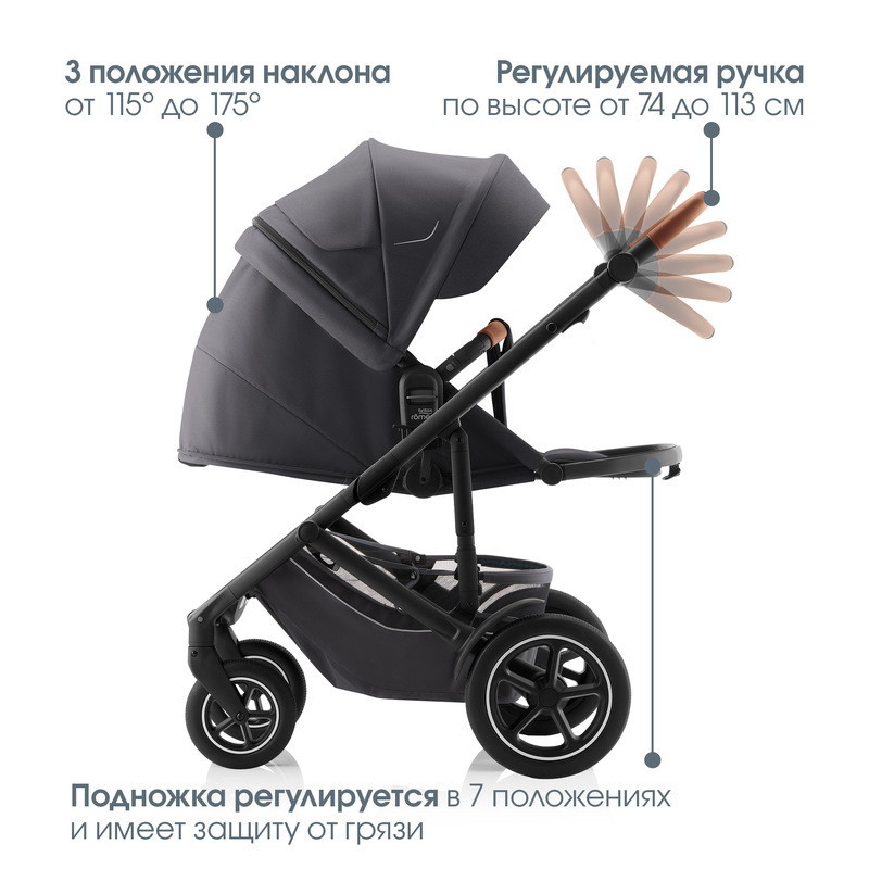 Устанавливается штатным ремнем или на поворотную базу Britax Roemer, а также совместима с большинством прогулочных колясок.